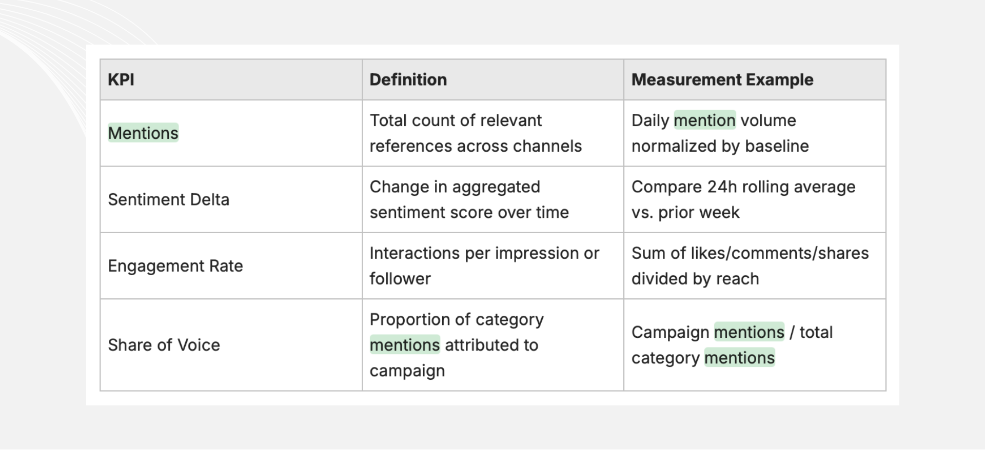 Campaign impact is measured by tracking KPI changes against pre-defined baselines and attribution windows: rises in mentions, positive sentiment lift, increased engagement rate, and improved share of voice indicate success when aligned with campaign objectives. Attribution combines temporal proximity (timelines of campaign activities) with cross-channel correlation to estimate contribution; for example, a spike in mentions immediately after a targeted post implies direct impact, while sustained sentiment shifts suggest deeper resonance. Calculating impact often uses weighted models that assign different values to mainstream reach versus social engagement depending on campaign goals. Example ROI estimation pairs earned media equivalency with conversion metrics when available, though PR-specific ROI should consider long-term brand metrics as well.